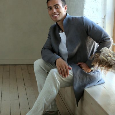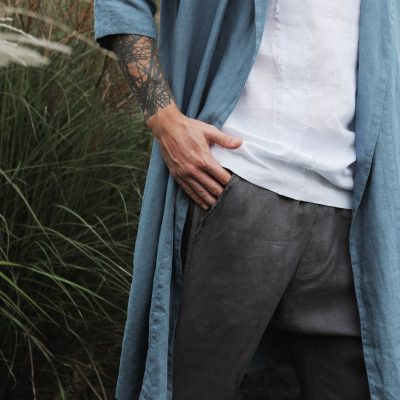 Mens Linen Bathrobe Jacket Juniper In Blue Grey
